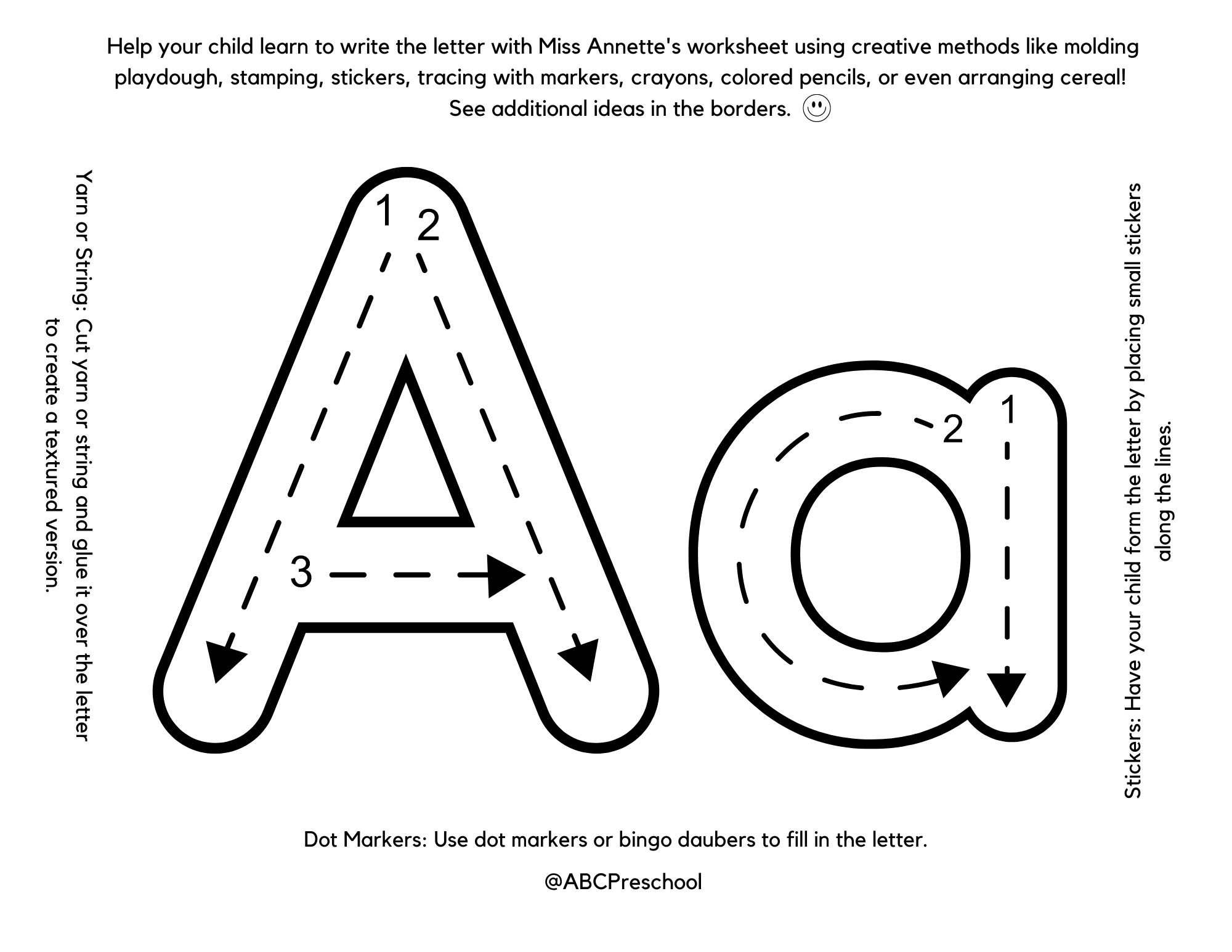 Creative Letter Aa: Complete the “hands-on” letter Aa worksheet by choosing one of the four suggested creative activities or come up with your own unique idea.