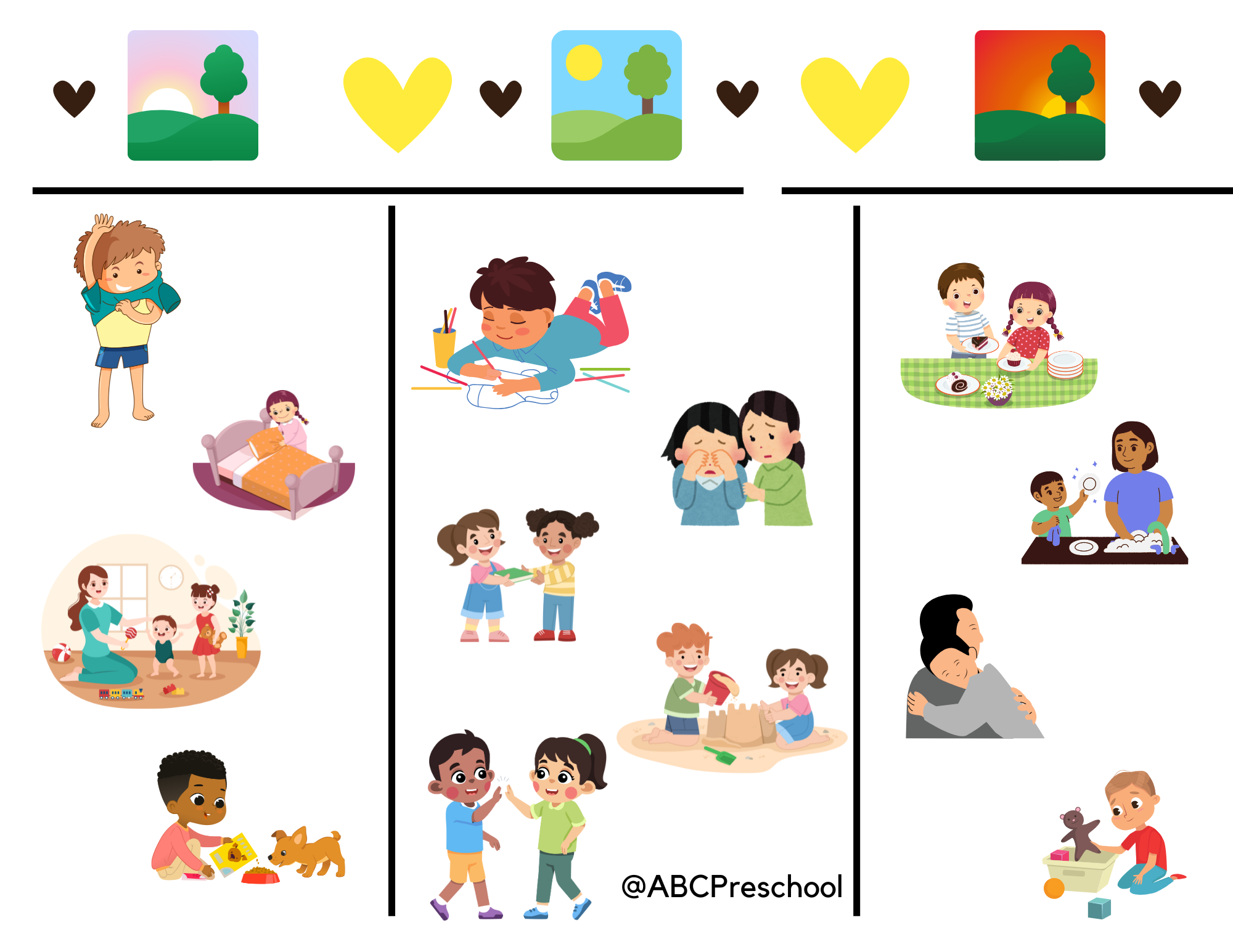 Kindness All Day Long: Discuss times of the day when kindness can be shown. Help your child choose a way to show kindness during morning, noon, and night.