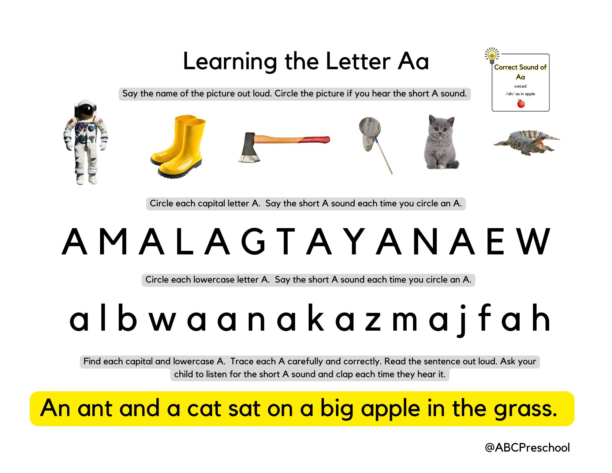 Watch the “All About the Letter Aa” video. Invite your child to watch closely. Ask this question after watching, “What is one word beginning with the /a/ sound ?”