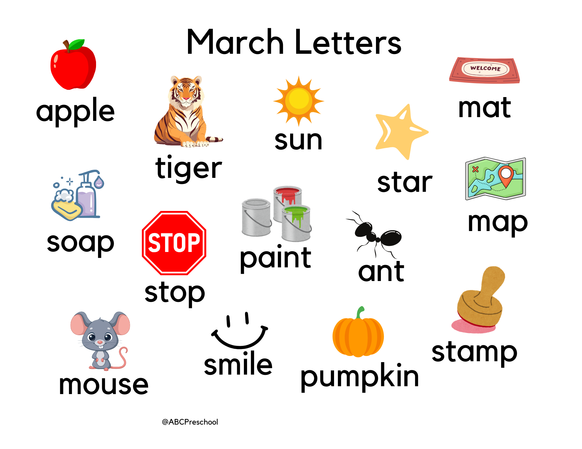 March Letters Find the letter A’s: Encourage your child to find and underline each letter “A” in the list of words. After underlining, ask them to count how many “A’s” they found. This activity builds letter recognition and counting skills in a fun, hands-on way! Hint: there are eight